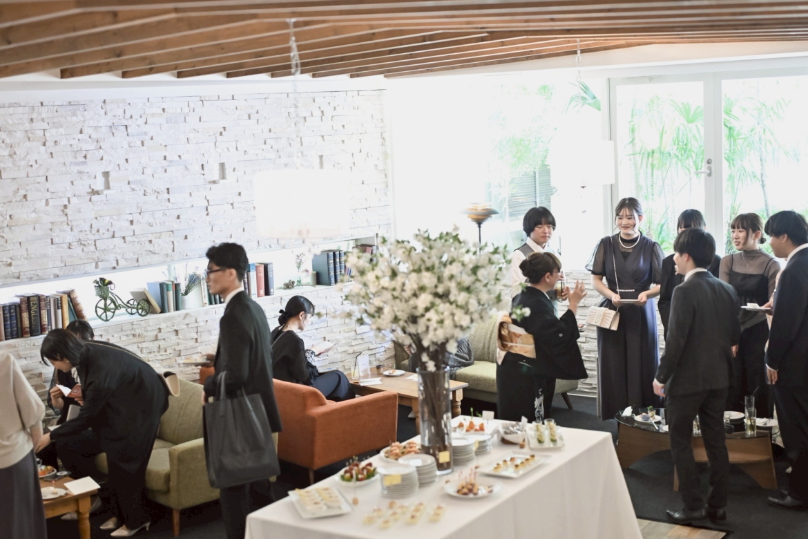外からは見えにくい“隠し部屋”のような空間。初めて足を踏み入れると、少しワクワクする遊び心のある造りが印象的です。ときには展示室のように、ときにはご家族だけの温かな食事会の場として、使い方次第でさまざまな表情を見せてくれます。室内の窓からはやわらかな緑が広がり、ふと外を見ると、久しぶりに会う友人の姿が目に入ることも。その瞬間、「来てよかったな」「今日はきっと楽しい一日になる」そんな気持ちが自然と湧いてくる、特別な始まりを感じられる場所です。