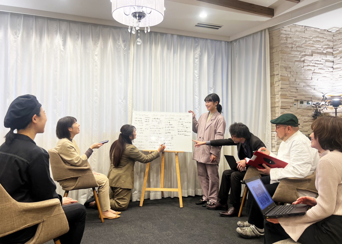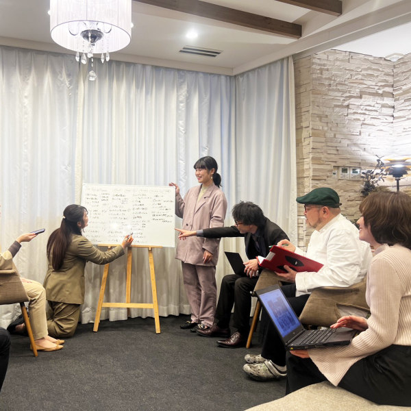 結婚式のアイデアを出し合う時間を設けています。 職種も立場も関係なく、誰もが自由に意見を出せるこの会議は、 新しい発想や改善の種が次々と生まれる場です。 小さな声が、大きな変化のきっかけになることもあります。 一人のアイデアが、チームの力で形になり、やがてお客様の笑顔につながっていく。 “全員で考え、全員で創る”未来を動かすのは、今日生まれたひとつのひらめきかもしれません。